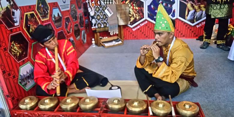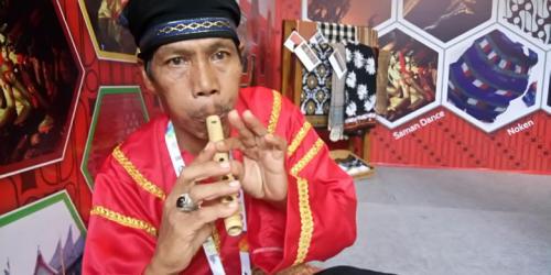 Djafri Yunerdi, seniman asal Padang Pariaman, Sumatera Barat memainkan alat musik tiup dengan merdunya dan cukup banyak pengunjung datang di stan lokasi acara.